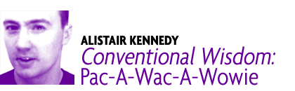 The previous evening, also spent in the company of our old friend Mr Beer, had seen a conversation of a shamefully geeky stripe - our collective nerd knowledge had been unable to remember the catchphrase used by Pac-Man in the early-'80s cartoon that bore his name. Yes, I know, we're not proud of ourselves. However, the version we eventually decided on as closest to accurate - "Pac-A-Wac-A-Wowie" - was, we decided, too amusing to be tossed aside as a product of our drunken pop-culture geek-out. And so the two ideas were wed...